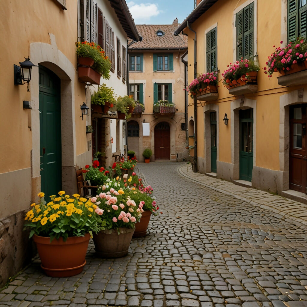 A picturesque European village with cobblestone streets, historic buildings, and blooming flower boxes