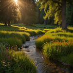 A picturesque meadow surrounded by vibrant green trees, with colorful wildflowers blooming under the warm glow of the afternoon sun. A gentle stream flows through, adding to the peaceful ambiance