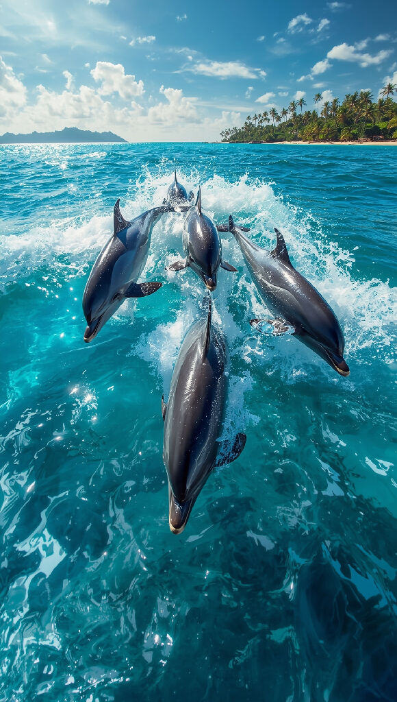 A pod of dolphins with sleek gray bodies and dorsal fins leaping out of turquoise blue water with sunlight reflections dancing across the waves