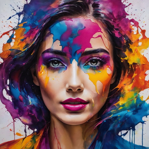 A portrait of a woman where her features are made up of splashes of vibrant colors. Her form is abstract yet recognizable, with colors blending and flowing together like a living painting.
