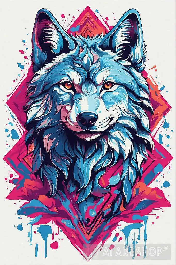 A psychedelic graphic design with a blue wolf. Use the design style of RVCA clothing brand. ((White background)), vector style, for T-shirt printing.