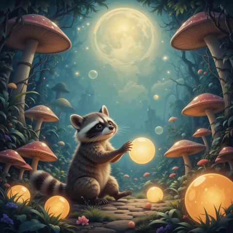 A raccoon playing with glowing orbs in a mushroom jungle under a starlit dome