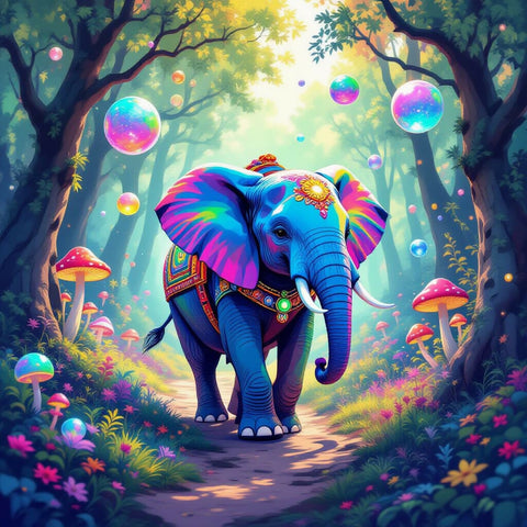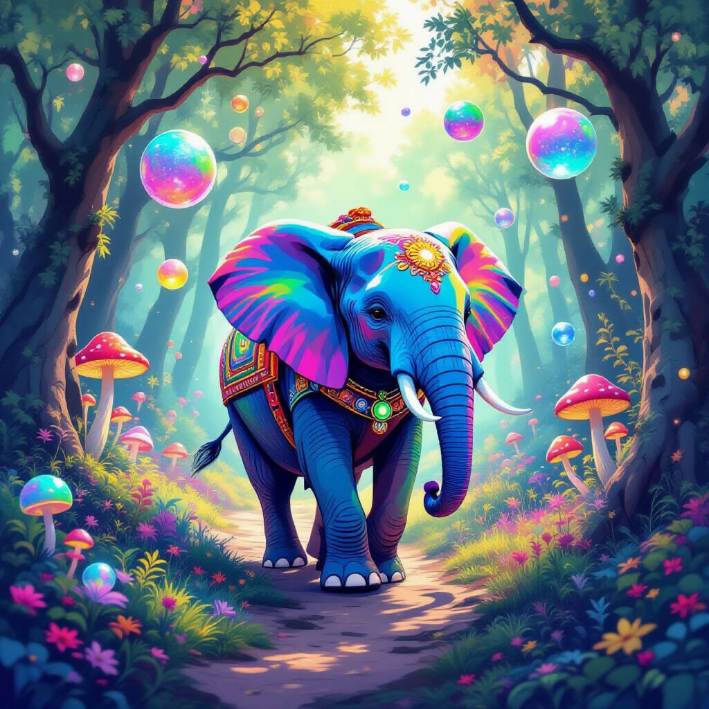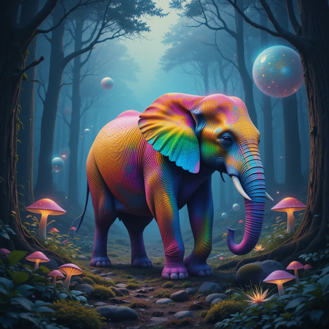 A rainbow-colored elephant walking through a dreamscape forest with floating orbs and glowing mushrooms