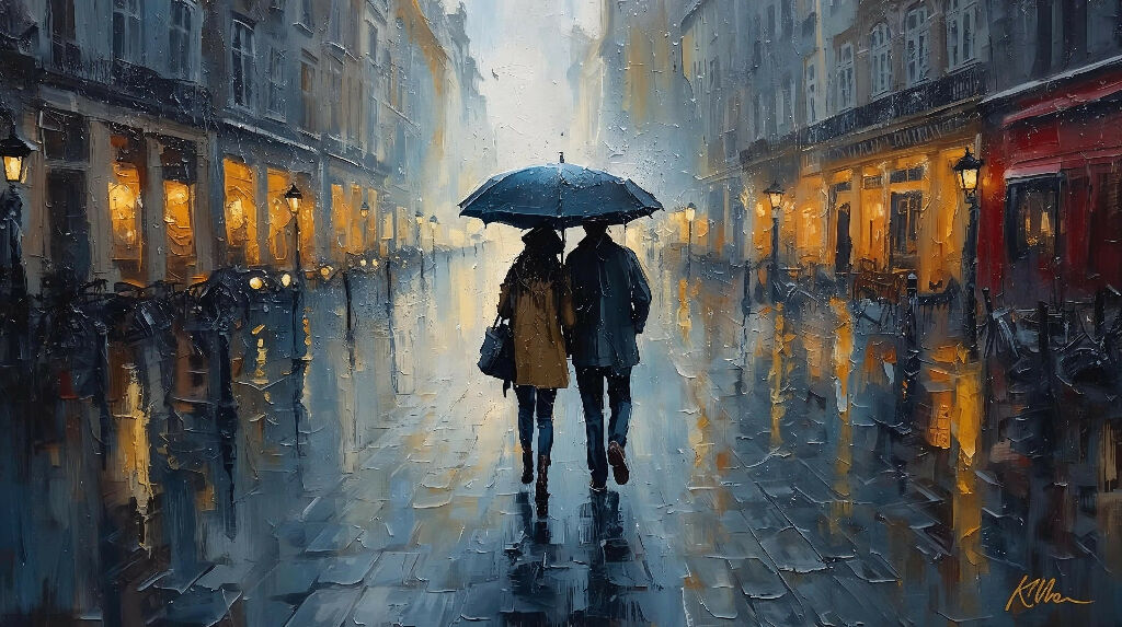 Vibrant abstract painting of a couple walking down rainy street in Brussels.