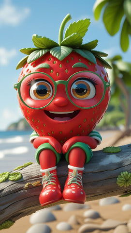 A realistic 3D digital illustration of a cute anthropomorphic strawberry wear glasses sit on the branch on the beach