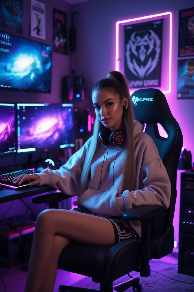 A realistic photo of a real human female gamer in her cozy RGB-lit gaming room at night
