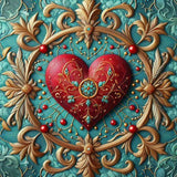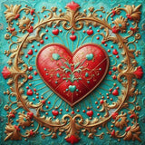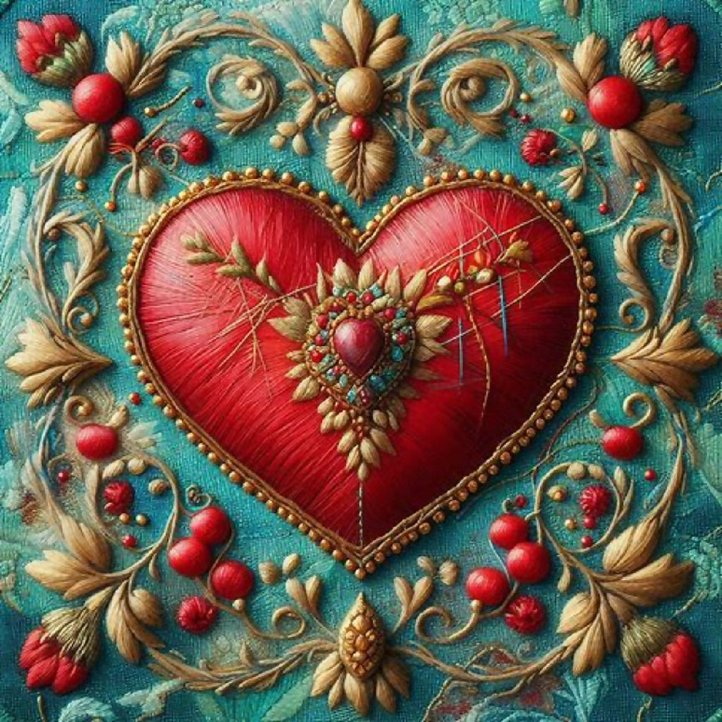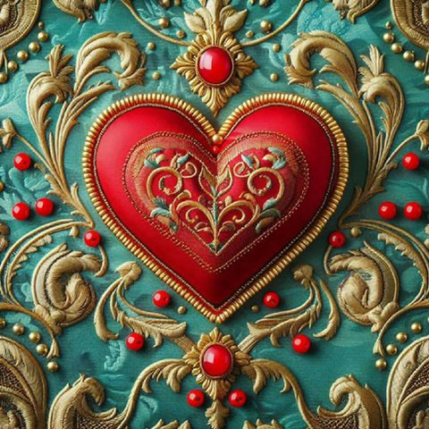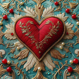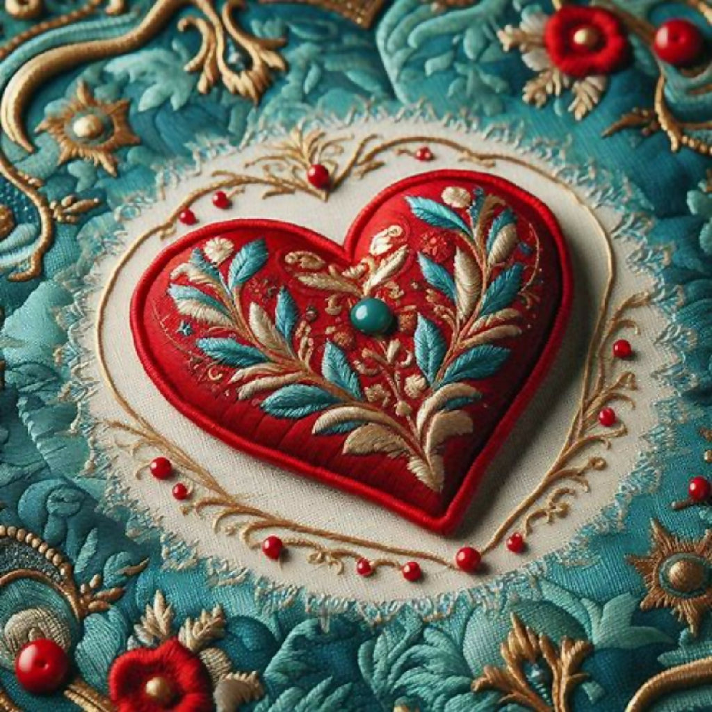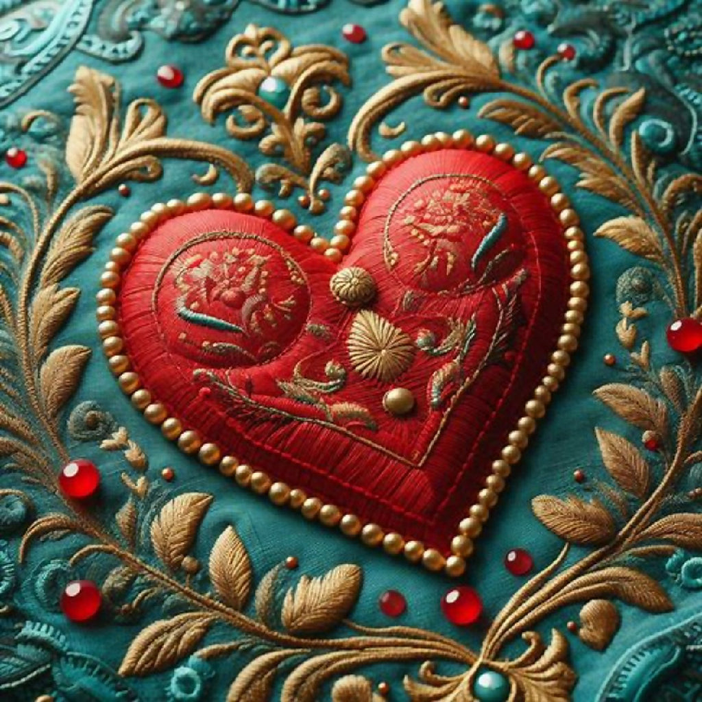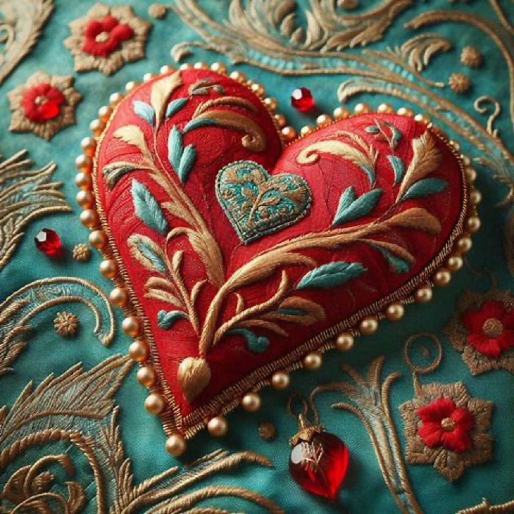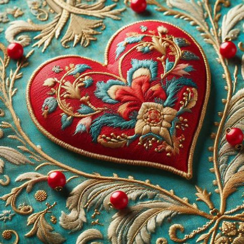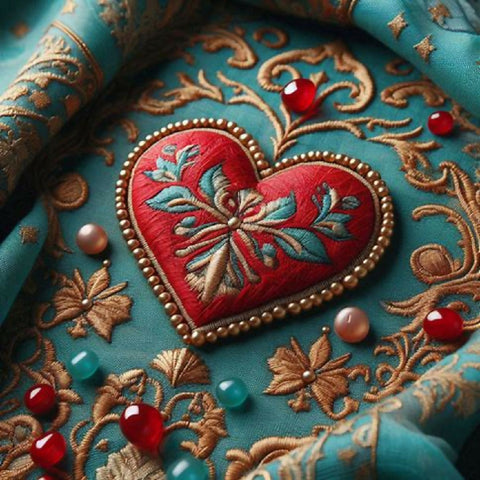 a red heart embroidered with fine gold threads on a piece of dark blue cloth. The heart appears to be made of soft velvet fabric, while the cloth appears to be made of silk or satin.