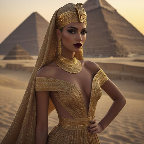 A regal, enigmatic Egyptian woman, adorned with 24-karat gold jewelry and headdress, poses elegantly against the majestic backdrop of the Great Pyramids of Giza at sunset, with the warm orange hues of the desert landscape casting a mystical glow on her olive-toned skin. She wears a bespoke, floor-sweeping haute couture gown with intricate gold embroidery, draped elegantly across her shoulders, showcasing the opulence of ancient Egyptian culture. Her dark, kohl-lined eyes gleam with mystery, while her full lips, painted a deep crimson, curve into a subtle, enigmatic smile. The professional photography captures every detail of the luxurious ensemble, with the golden accents and dark shadows accentuating the drama and sophistication of the high-fashion scene, evoking the essence of Old Hollywood glamour in the heart of the Egyptian desert.