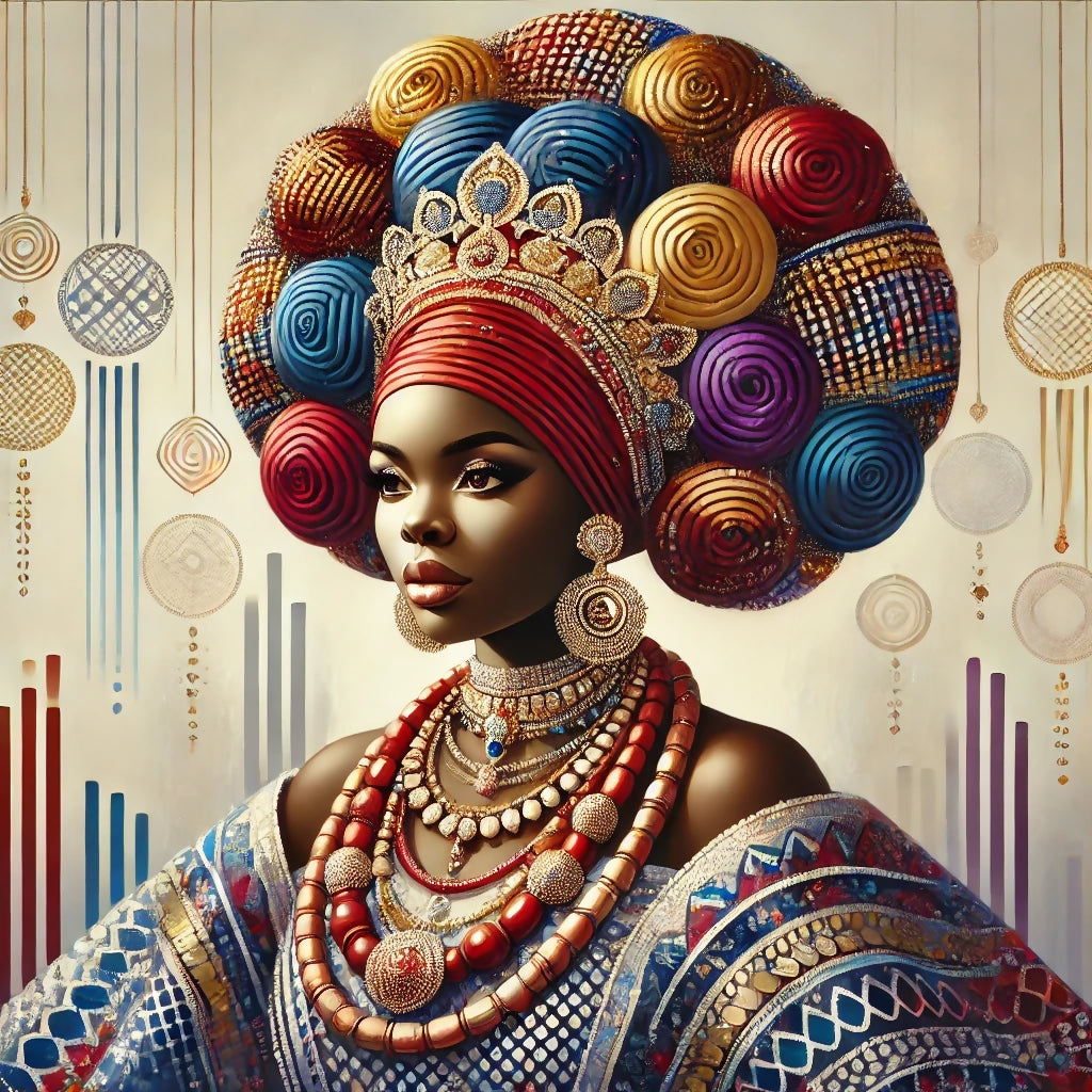 Celebrate the timeless beauty and royal heritage of Yoruba culture with this stunning artwork. The piece features a regal Yoruba queen, adorned in a vibrant gele headwrap and intricate traditional jewelry that exudes elegance and authority. Every detail—from the bold, colorful patterns of the gele to the finely crafted jewelry—reflects the richness and sophistication of Yoruba tradition.