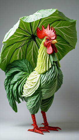A rooster, sculpted from meticulously arranged pieces of green and yellow Napa cabbage, stands centrally in the image. Its head and crest are a vibrant red, made of a similar material, contrasting beautifully with the vegetables. The rooster's body, wings, and tail feathers are meticulously fashioned from thin, overlapping pieces of cabbage. The rooster's posture is upright and proud. A large, natural-looking umbrella made from Napa cabbage leaves shades the rooster. The backdrop is a plain, light gray, focusing attention on the intricate sculpture. The lighting is even and bright, highlighting the details of the vegetable carvings. The overall style is artistic and imaginative, showcasing a unique and creative use of food as a medium. The composition is symmetrical, with the rooster positioned in the center and the cabbage leaves forming a natural umbrella. Important details include the precise shapes and textures of the cabbage pieces, which mimic the rooster's feathers. The image evokes a sense of artistic wonder and delight.