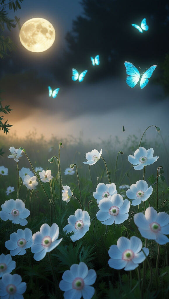 A serene and dreamy meadow filled with delicate Japanese anemones in soft white and pale pink hues