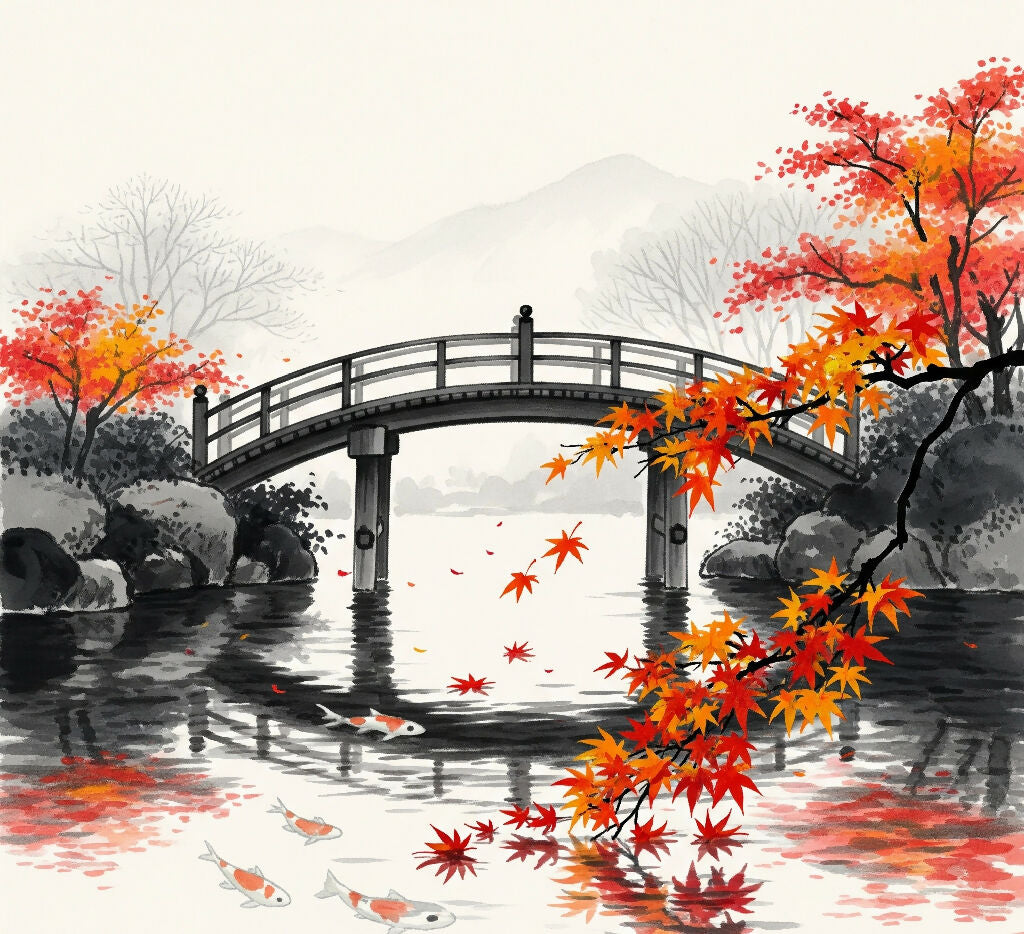 a serene autumn scene featuring a traditional arched bridge spanning a calm body of water