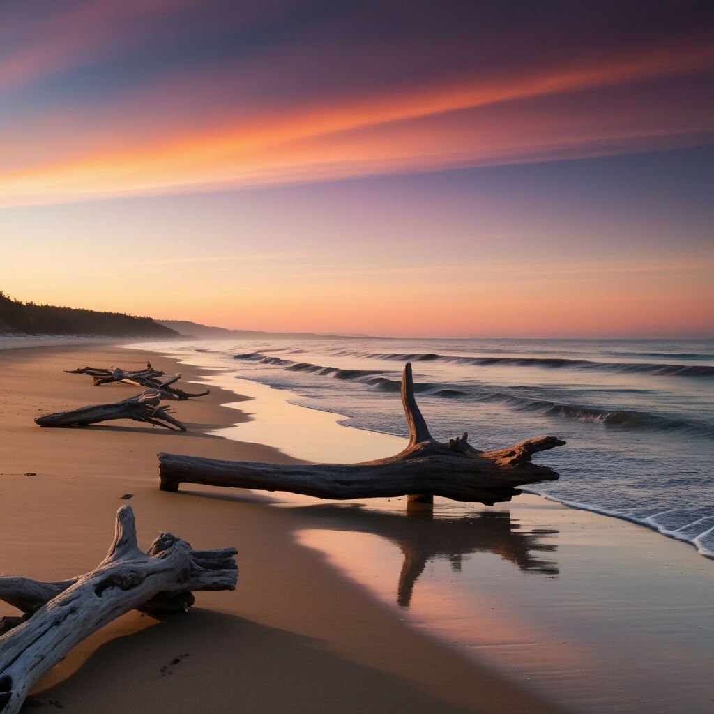 A serene coastal scene at sunset