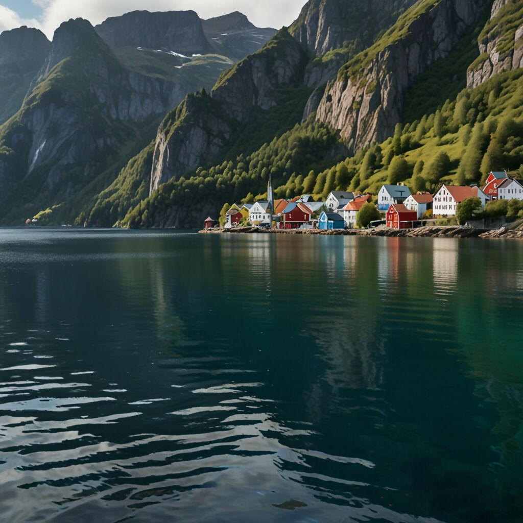 A serene fjord with steep cliffs, calm blue water, and a small fishing village on the shore 2