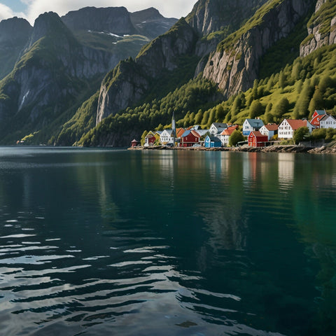 A serene fjord with cliffs, calm blue water, and a small fishing village on the shore