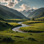 A serene mountain valley with a clear, winding river and lush green meadows