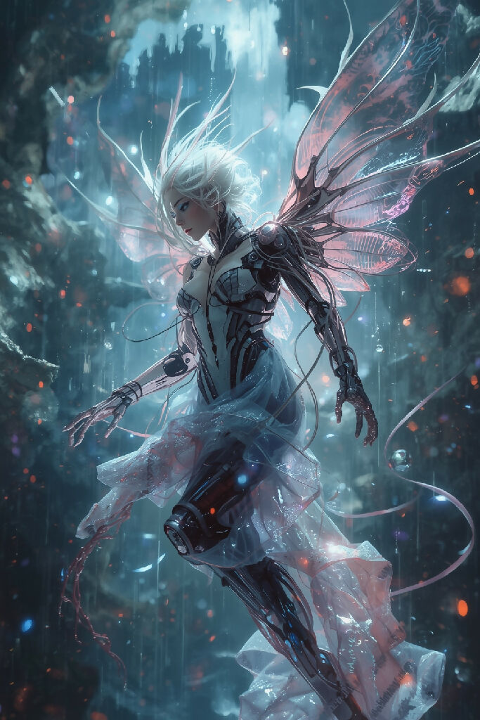 A shimmering, ethereal figure drifts between dimensions, their form a blend of sleek cybernetic enhancements and fantastical elements. This is a concept art piece for a video game character. The image is a digitally rendered painting, showcasing intricate details and vivid colors. The drifter's metallic limbs reflect the light, while translucent wings shimmer with an otherworldly glow. Wires and circuitry intertwine with organic elements, creating a mesmerizing juxtaposition of technology and magic. The overall composition is stunning and expertly crafted, inviting viewers to immerse themselves in the mysterious world this character inhabits.