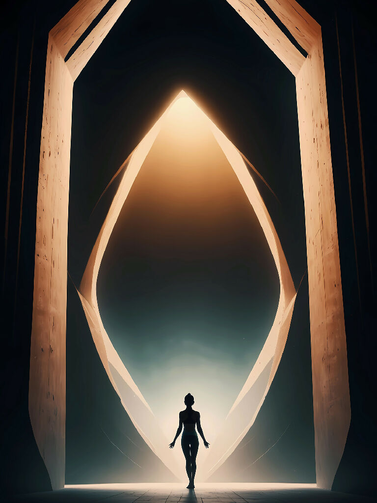 A silhouette of a woman in a yoga pose stands inside a cathedral-like space with high, arched beams