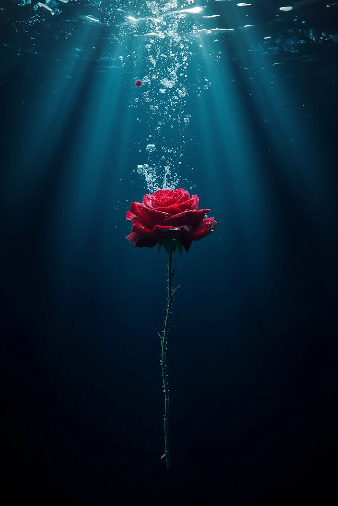 A single red rose sinking gracefully into the deep ocean, petals slowly breaking apart as it descends, surrounded by soft blue light beams and gentle air bubbles rising around it, cinematic lighting, ultra-detailed, dreamlike underwater atmosphere.