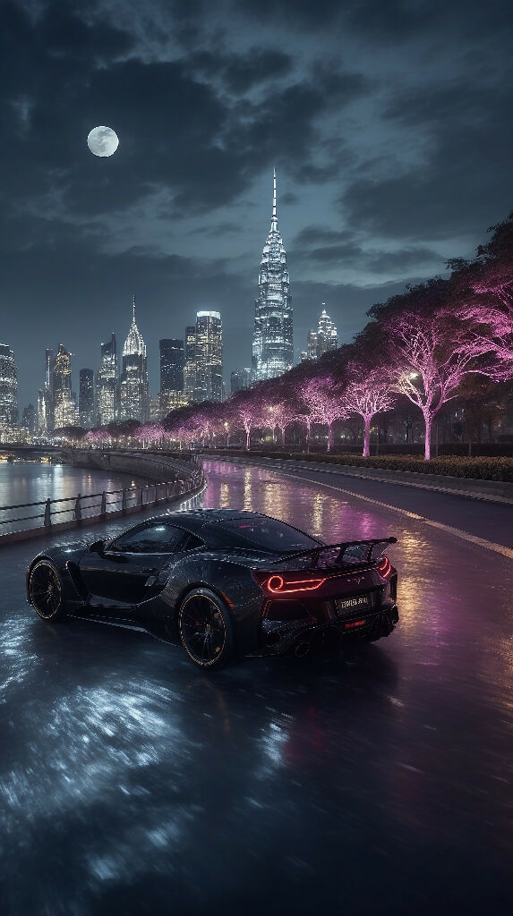 A sleek, futuristic black luxury sports car with gold-accented rims drifting at high speed on a glowing road beside a river at night. The city in the background features a fantasy skyline with illuminated skyscrapers, domed towers, and golden spires. The boulevard is lined with glowing neon-pink and purple trees, trimmed hedges, and designer street lamps. A full moon shines in a dreamy, partly cloudy night sky, reflecting softly off the water. The entire scene has a hyper-realistic, cinematic style with a touch of fantasy elegance.