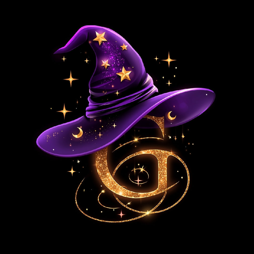 A spectrally alluring logo for Gene’s Costumes, a delightful emporium specializing in Halloween and Theater-themed attire. The centerpiece features a bewitching witch’s hat adorned with glowing stars and moon accents, shimmering with enchanting hues of deep purple and shadowy black. The hat is delicately perched atop a stylized "G" intertwined with glittering golden threads, evoking a sense of magical elegance and theatrical flair. The image, a digital illustration, is expertly crafted with meticulous attention to detail, showcasing vibrant colors and intricate design elements. This logo radiates sophistication and charm, promising top-notch costumes and outstanding service from Gene’s Costumes.