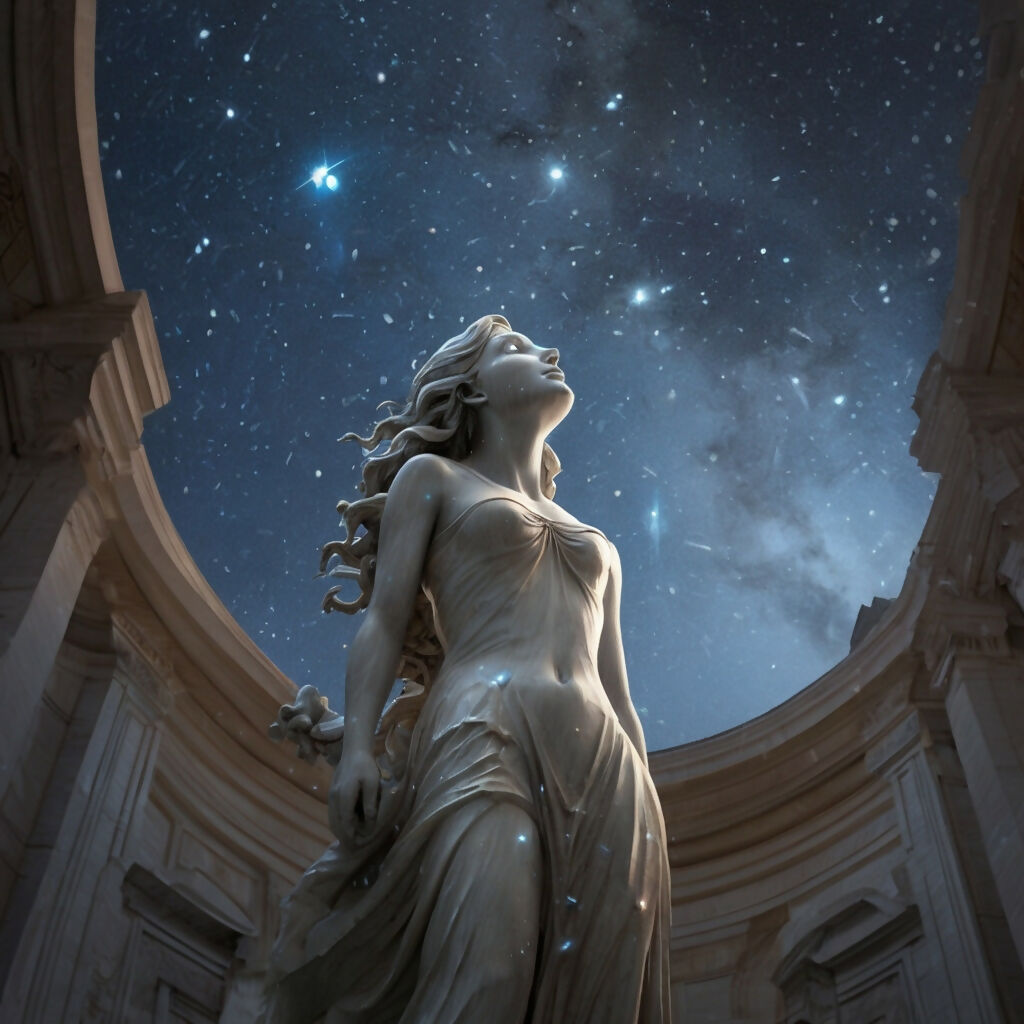 I wanted to convey the impression that the statue is admiring the starry sky.