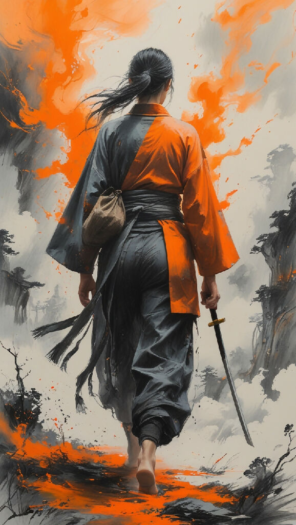 "A stoic female ronin monk steps into a boundless, ethereal landscape, her presence merging with the art around her. Clad in loose dark trousers and a bold orange kimono jacket, she walks forward, her silhouette dissolving into a maelstrom of blazing orange and smoky grey brushstrokes, a threadbare travel bag hangs at her side, and a slender katana is tucked securely at her hip. The swirling abstract paint mimics drifting fog and sparks of memory, making the figure seem both real and dreamlike. Rear view, high-detail digital painting, dramatic lighting, impressionistic motion blur, splash technique — a moment suspended between legend and reality, soaked in poetic and mysterious vibes.