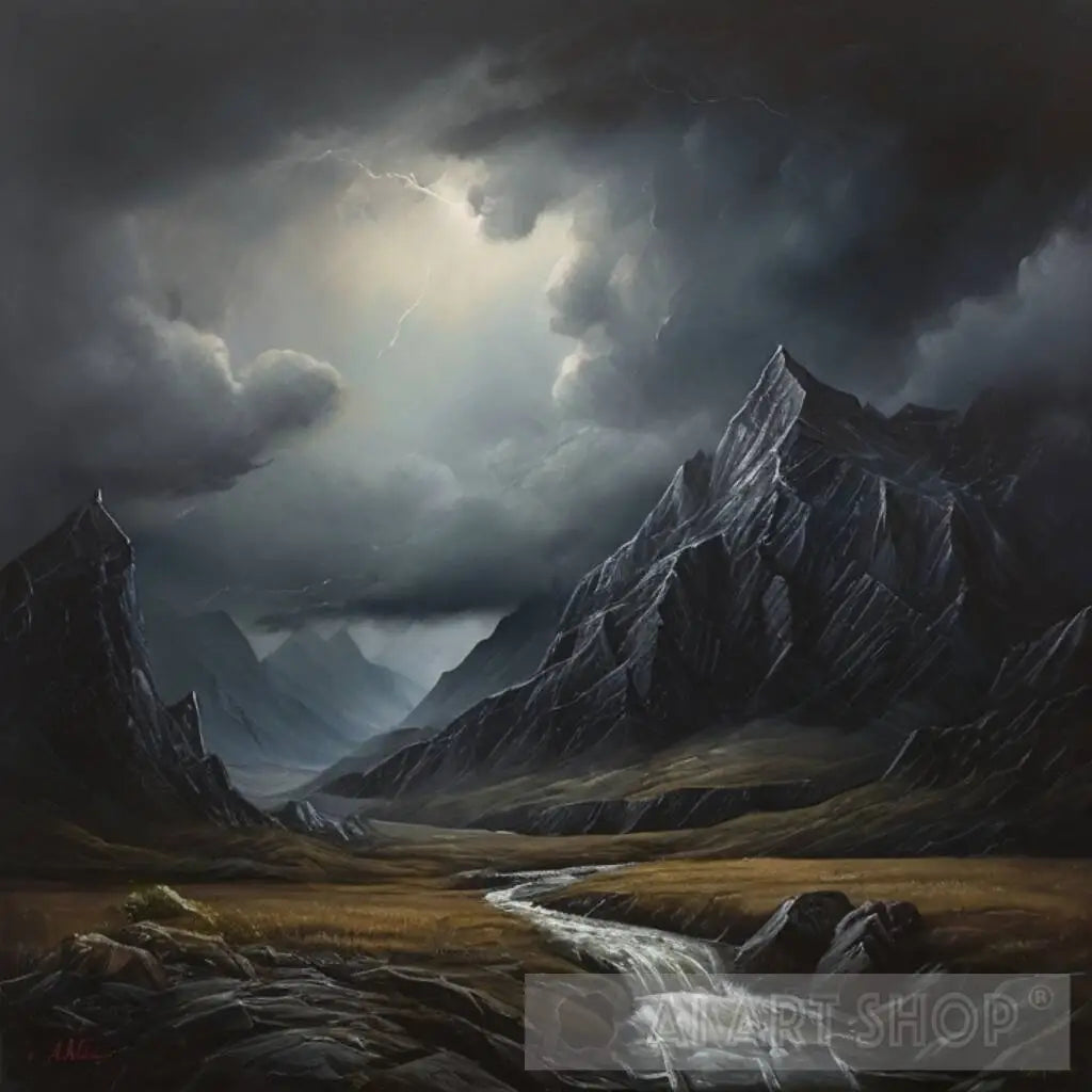 This captivating landscape painting features a dramatic mountain range illuminated by a powerful lightning strike. The churning river below reflects the energy of the storm, creating a sense of awe and power.