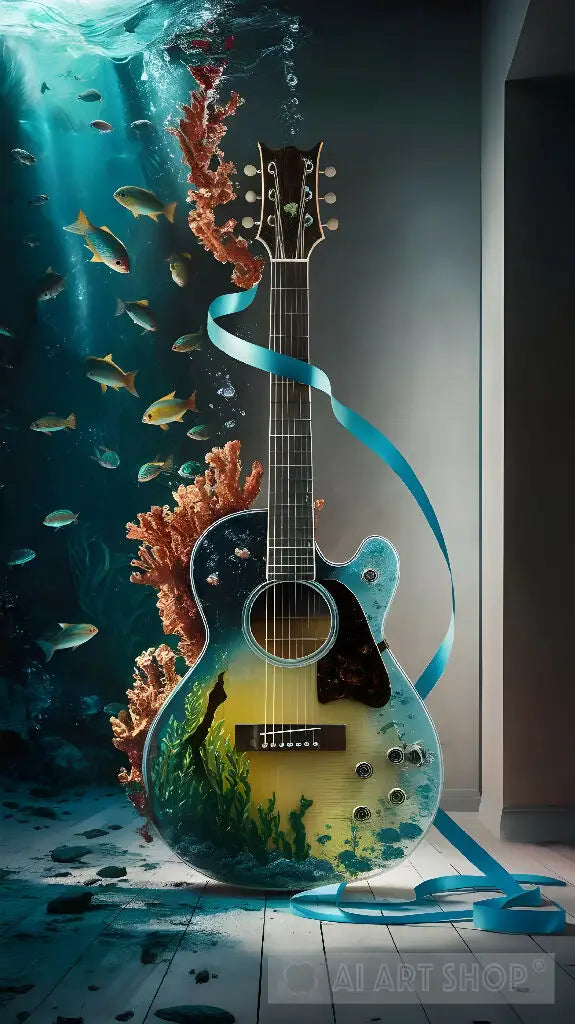 A stunning 3D render of a transparent glass guitar, filled with water, aquatic plants, and vibrant fish, seamlessly transitions into an enchanting underwater world. The guitar's neck morphs into a coral-like structure, teeming with life as fish swim gracefully between the instrument and the depths of the scene. The visual contrast between the guitar and the underwater environment creates a captivating effect. A minimal indoor setting is seen on the right side of the composition, adding drama to the scene. A graceful blue ribbon weaves around the guitar, bringing a touch of magic to this imaginative, conceptual art piece. The cinematic, vibrant, and conceptual nature of the artwork evokes a sense of wonder and creativity, inviting the viewer to explore the depths of this unique underwater world, blending the realms of music, nature, and fantasy. conceptual art, vibrant, 3d render, cinematic, product