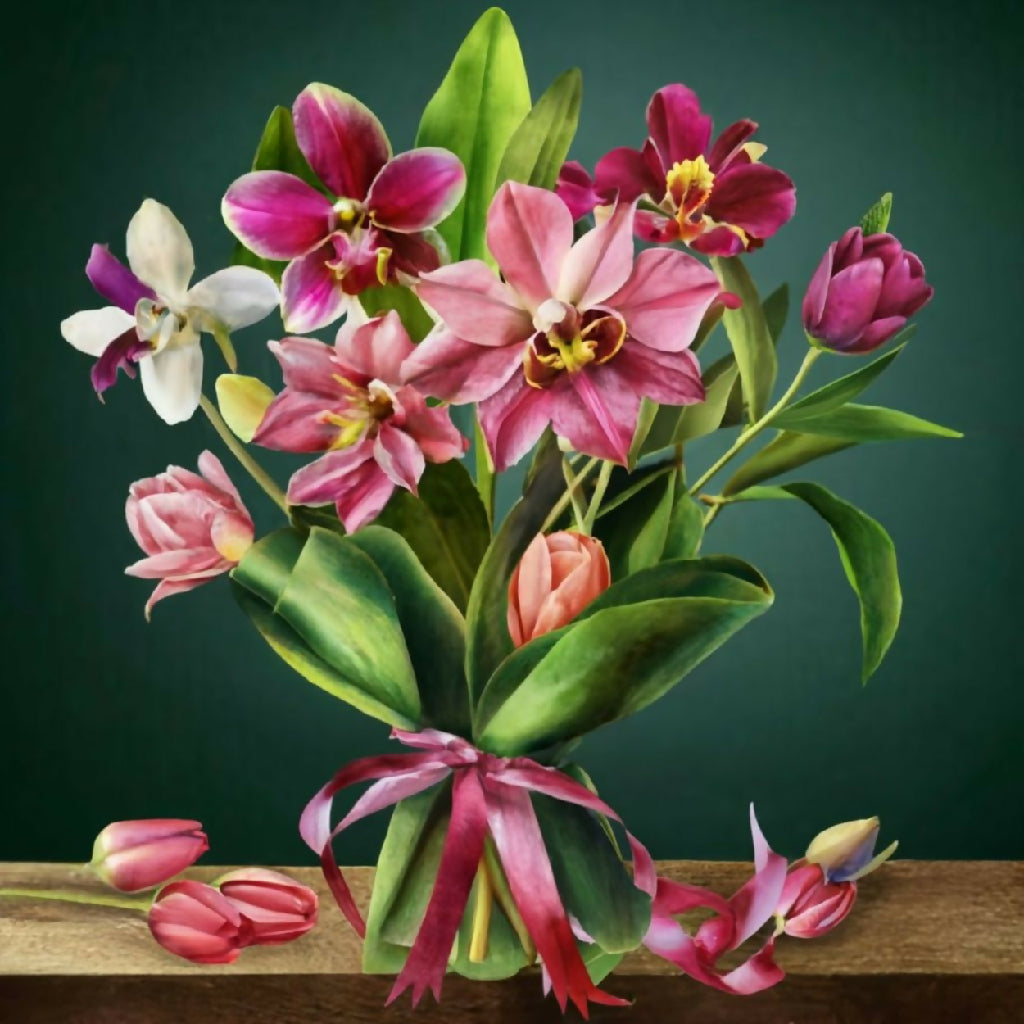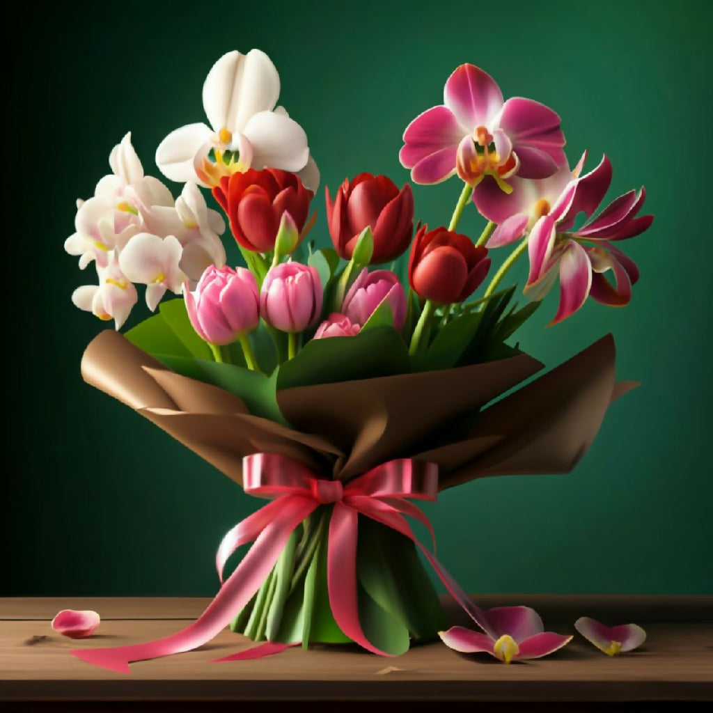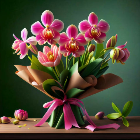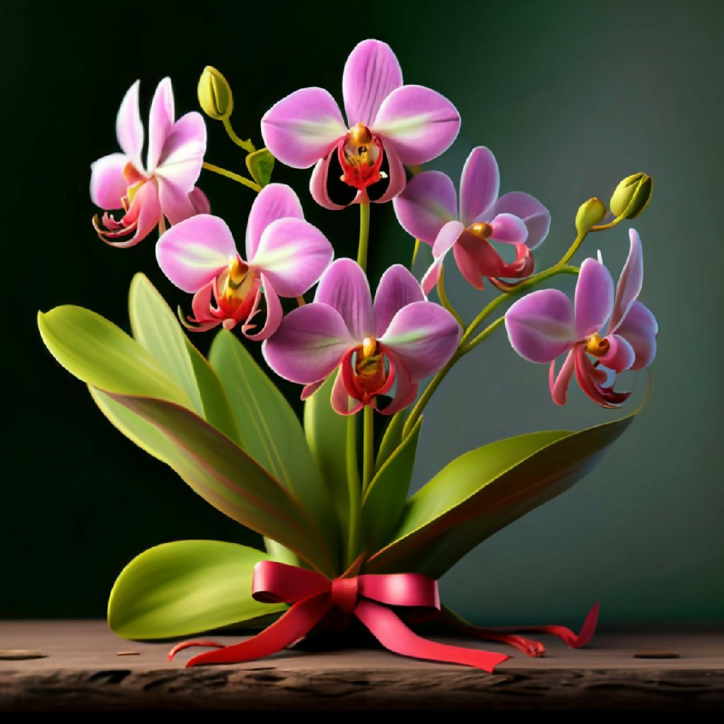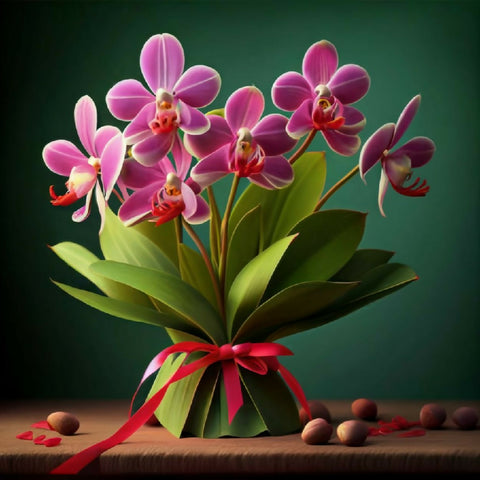 A stunning bouquet of vibrant pink orchids with delicate white and red accents, elegantly arranged with lush green leaves. The stems are tied together with a glossy red ribbon, creating a sophisticated and romantic presentation. The flowers rest on a rustic wooden surface against a dark, softly blurred background, enhancing the natural beauty and vivid colors of the blooms. The composition is rich in detail, showcasing the intricate textures of petals, leaves, and the satin ribbon, giving it a lifelike, artistic quality.