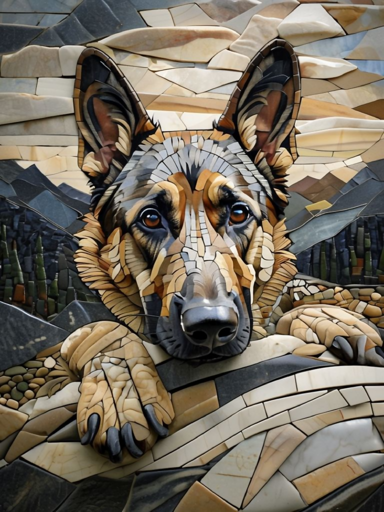 A stunning digital mosaic of a German Shepherd dog. The image showcases intricate details of the dog's fur, eyes, and paws, using a variety of stone tiles to create a realistic and textured effect. The dog is depicted against a backdrop of mountains and trees, giving the impression of a majestic creature in its natural habitat. The overall effect is one of peace and tranquility.
