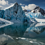 A stunning glacier with blue ice formations, towering peaks, and a bright, sunny sky