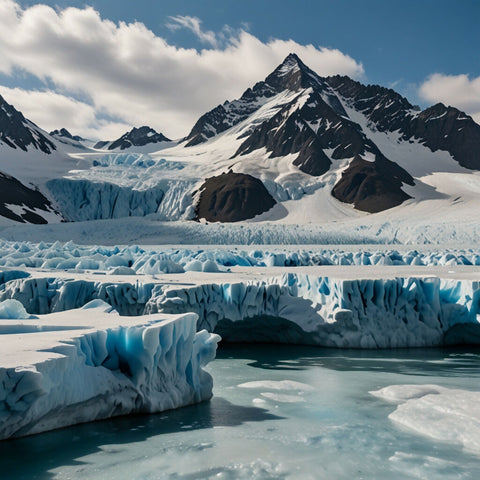 A stunning glacier with blue ice formations, towering peaks, and a bright, sunny sky