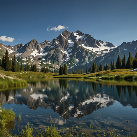 A stunning mountain range with snow-capped peaks reflecting in a crystal-clear alpine lake. The scene is framed by lush green meadows dotted with wildflowers and a bright blue sky overhead
