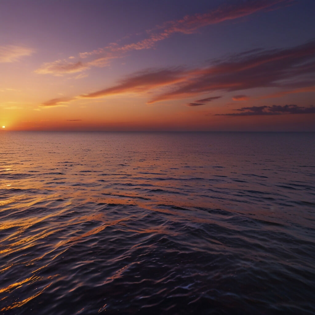 A stunning sunset over a tranquil ocean, with the sky painted in shades of orange, pink, and purple