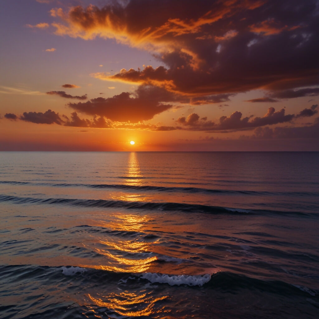 A stunning sunset over a tranquil ocean, with the sky painted in shades of orange, pink, and purple