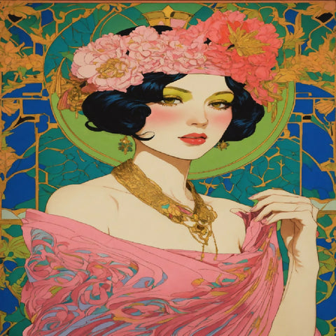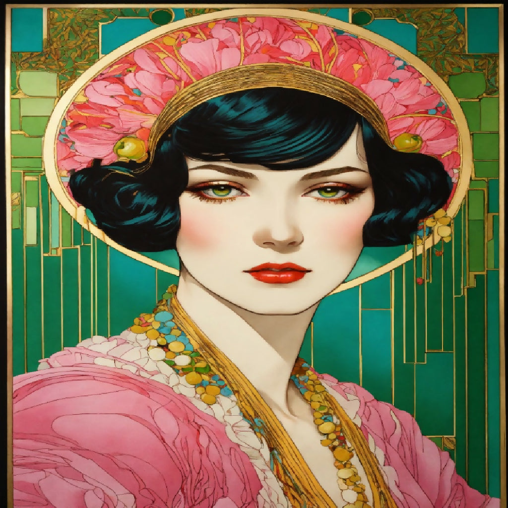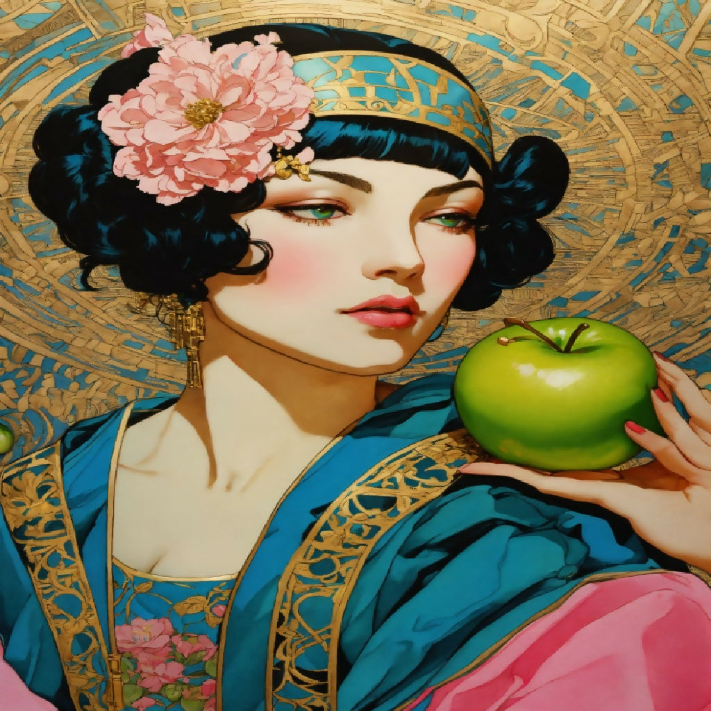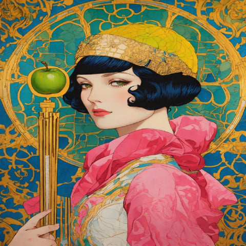 The image you provided depicts a stylized artwork of a person in profile view with their face obscured by pixelation. The person is wearing a pink garment with ruffled textures and holds a golden rod vertically in one hand. Above the person’s shoulder rests an apple. The background features an intricate pattern of blue and gold, reminiscent of Art Nouveau designs, particularly those by Gustav Klimt. The blend of these elements creates a visually striking and unique composition.