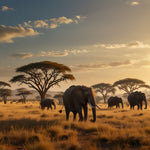 A sunlit savanna with acacia trees, golden grasslands, and a herd of elephants
