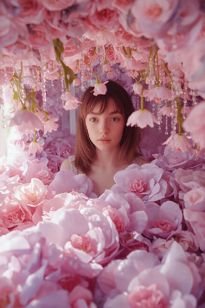 a surreal and vibrant cinematic photo of a 25-year-old girl with delicate facial features and smooth pale skin walking through a floral fantasy room where jelly-like flower petals in shades of pastel pink and lilac form a bed, the petals glow with dewdrops, dripping in translucent pink and lilac tones, surrounded by soft natural light, with a shallow depth of field, capturing the dreamy atmosphere, in a photorealistic style with film grain, emphasizing the vibrant colors and delicate textures of the floral scene.