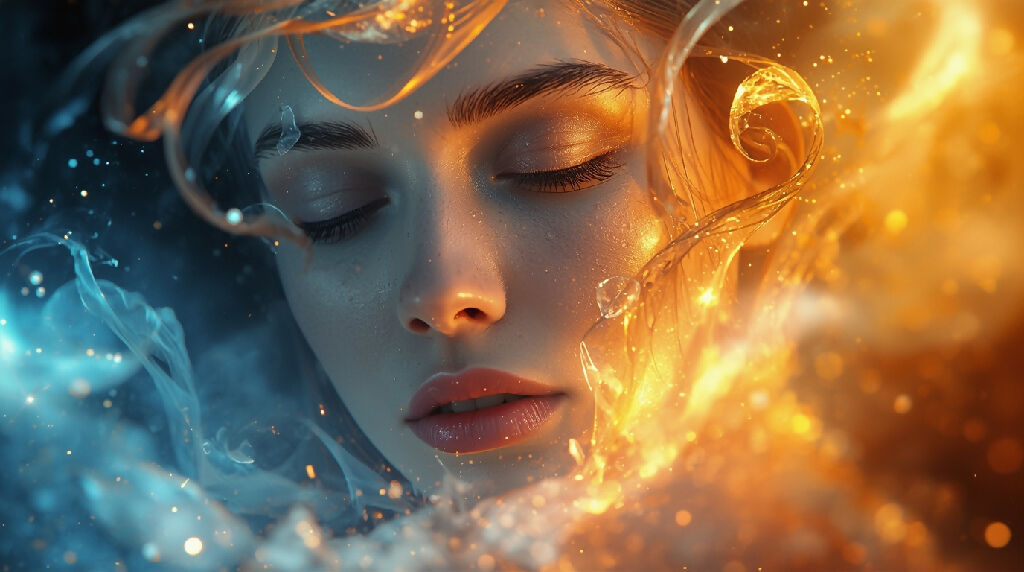 A surreal, atmospheric close-up of a serene face surrounded by luminous waves of light. Flowing ribbons of fire and water intertwine around the portrait, blending with airy mist and crystalline textures that shimmer softly. The colors shift between deep sapphire blues, glowing amber, and radiant silver, creating a magical and poetic mood. The background is abstract and dreamlike, filled with soft radiant particles, evoking a sense of hope and transcendence. Futuristic, cinematic, and ethereal in tone.