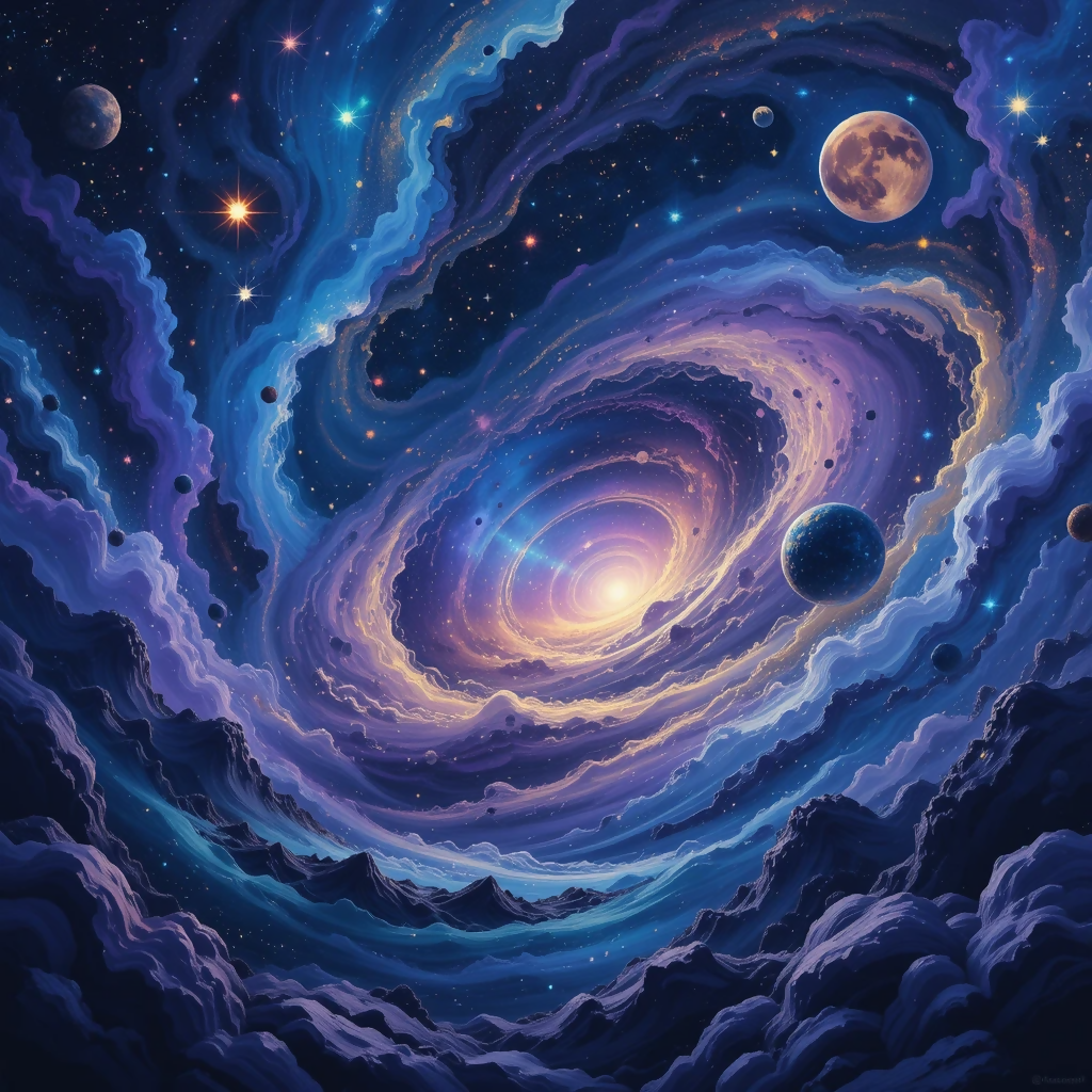 A breathtaking galaxy scene filled with swirling nebulas, distant stars, and celestial planets. The composition uses rich hues of deep blues, purples, and subtle hints of gold, evoking a cosmic feel that transports viewers into the vastness of space. The ethereal beauty of this artwork captures the awe-inspiring nature of the universe, offering a glimpse into a dreamlike, otherworldly realm. Perfect for space enthusiasts, those seeking to add a touch of mystery and wonder to their surroundings, or for use in any cosmic-themed design project.
