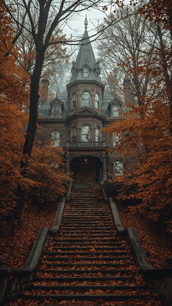 A towering Victorian mansion stands alone in the heart of a dense autumn forest