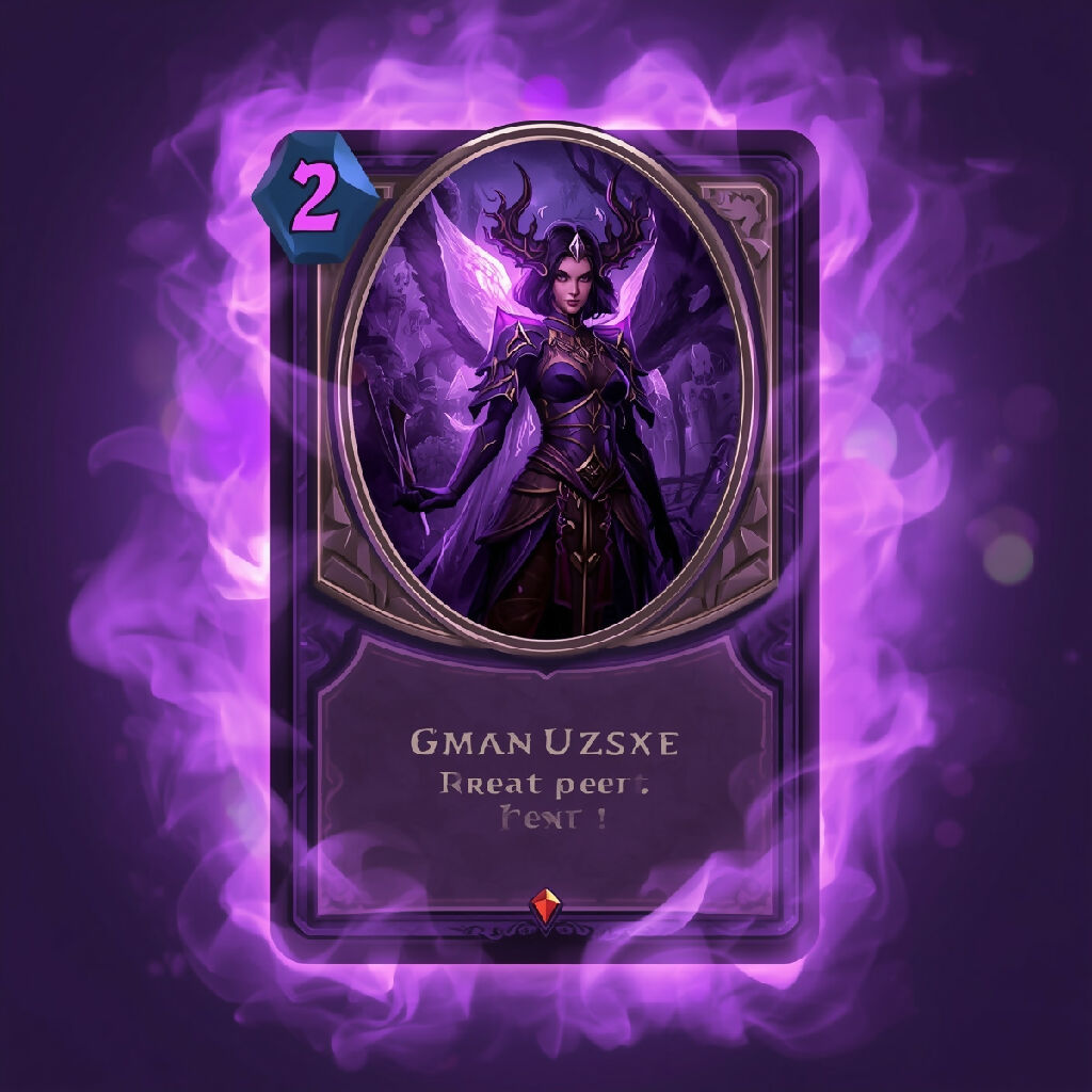 > A trading card game (TCG) base template, dominated by a large artwork area taking up the top and main portion of the card. Include a medium-sized text box in the middle and a smaller text box at the bottom for stats or ability text. Around the edges of the card, create an ethereal purple fog that softly fades inward, giving a mystical, dreamy, and magical aura. The design should feel elegant, fantasy-inspired, and atmospheric. The card should be well-balanced for art display — minimal clutter, sharp frame edges softened by fog effects, and subtle glow highlights along the border. Style: cinematic lighting, fantasy trading card, detailed textures, soft gradient lighting, elegant layout, 4K render, art-focused design. Aspect ratio: 2:3 or 1024x1536