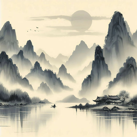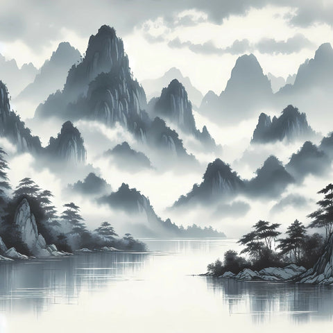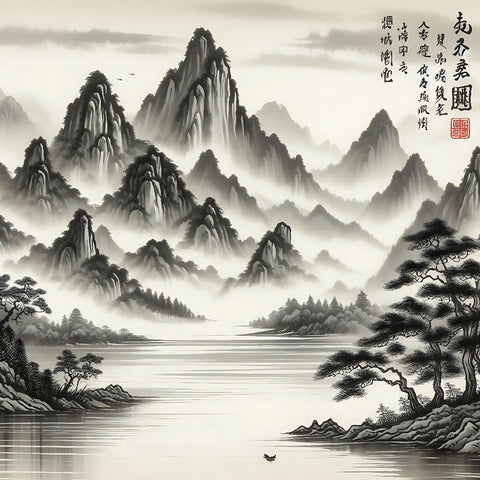 A Traditional Ink Wash Painting of Misty Mountains Rising Above a Tranquil Lake Rendered in graceful monochrome, this timeless ink wash painting evokes a serene landscape where ancient mountains drift through rising mists. Each brushstroke flows like breath across the paper—soft peaks emerge from the fog, mirrored in the glassy stillness of a lake below. The composition balances emptiness and presence, inviting stillness and reflection. Rooted in Eastern artistic tradition, it embodies a quiet dialogue between nature, spirit, and ink.