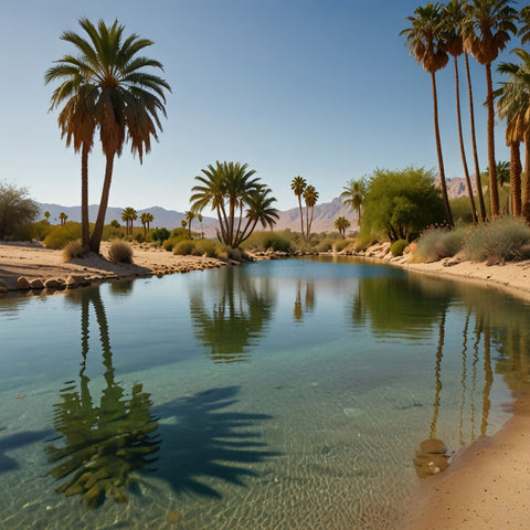 A tranquil desert oasis with palm trees, clear water, and blooming flowers