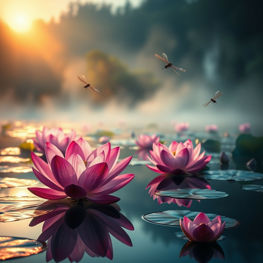 A tranquil lotus pond at dawn pink blossoms floating on mirrored water