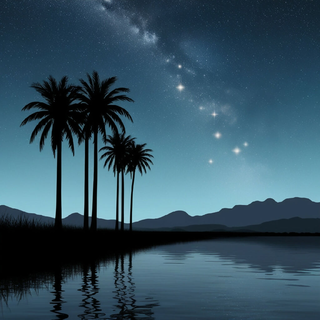 A tranquil night scene with palm tree silhouettes reflected in still water under a star-filled sky, 1 of 4