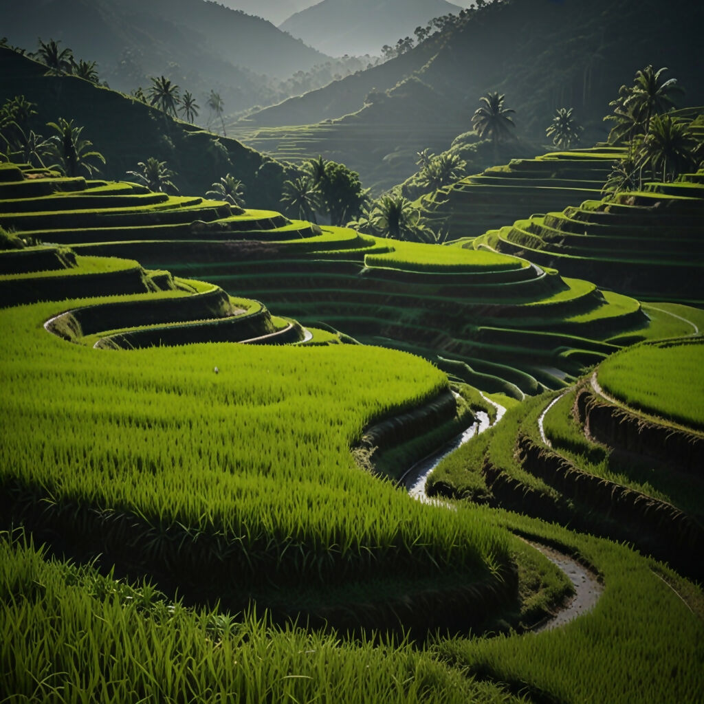 A tranquil rice terrace in Southeast Asia with lush green paddies and a blue sky