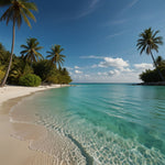 A tropical beach with crystal-clear turquoise water, white sand, and gently swaying palm trees