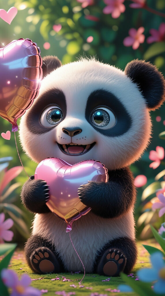 A vibrant, high-definition, 3D illustration of an adorable chibi panda with oversized, sparkling eyes, clutching a heart-shaped balloon, set against a bright, floral garden backdrop, radiating a joyful expression, with intricately textured fur, and soft, warm lighting that accentuates the subject's gentle features, including a subtle sheen on the balloon and delicate petals on the flowers, all rendered in ultra-high resolution with meticulous attention to detail, evoking a sense of wonder and delight.
